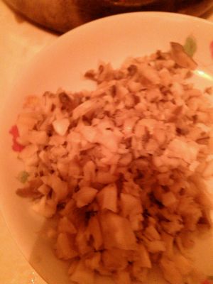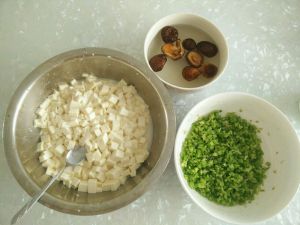 芹菜切碎,加盐。豆腐切丁,加盐,弄咸一点。木耳泡上。等一个钟头
