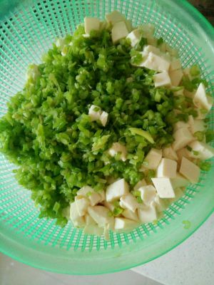 把腌好的芹菜挤干水分,和豆腐一起倒进篮子里,把水分沥干,这样馅才不会水分过多