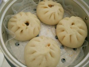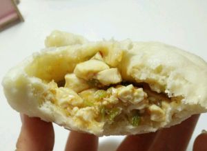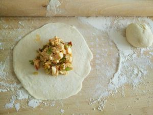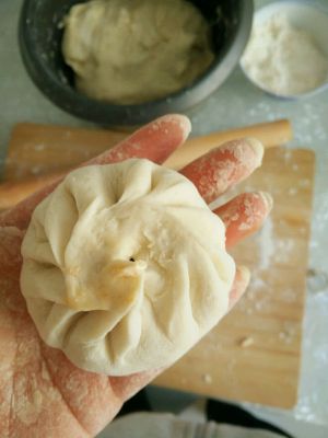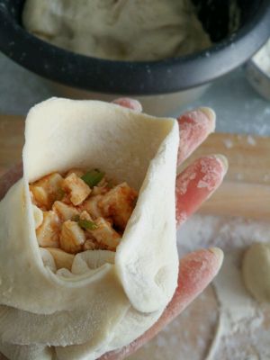 发酵好的面团揉压排气,再发一次。拿出来揪成鸡蛋大小的剂子,擀成中间厚边缘薄的面皮,放入陷料。