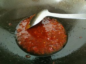 锅里多放点油,因为是全素包子。油热放入两大勺郫县豆瓣和两大勺白糖,小火慢炒,炒出红油。
