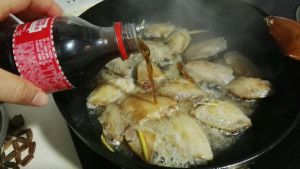 等鸡翅煎至2面焦黄之后,倒入500毫升的可乐,加入2汤匙生抽调色,然后盖上锅盖,大火煮开后转成小火,焖煮40分钟。