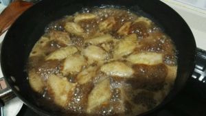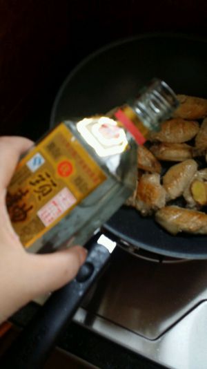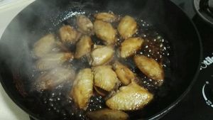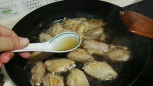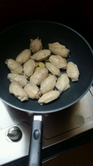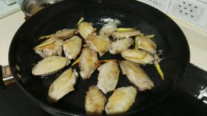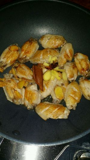 起锅加油烧热,油温6成热时,将腌制好的鸡翅一块一块地放入锅中,把姜片也放进去,将鸡翅煎至焦黄之后,翻个面,将另一面也煎至焦黄。