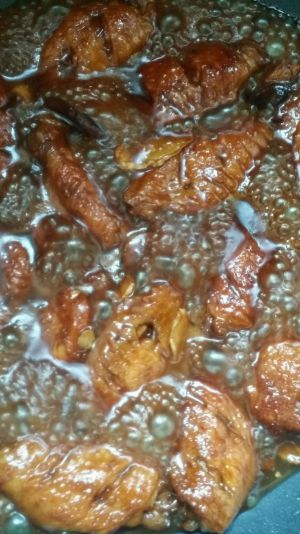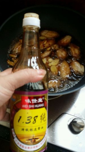 此时锅内很干而且温度很高,用2勺料酒呛一下锅,用盖子盖一下。(个人觉得这招很好用,特别去腥味,不管是鸡、鸭、鱼、肉都很实用。)