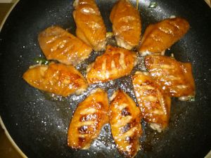 平底锅烧热转小火,鸡翅放进去煎致金黄翻面,鸡翅本事就油可以不额外放油