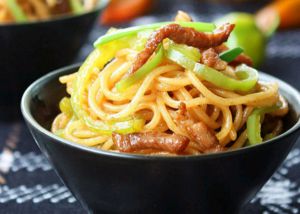 待锅内再次煮沸后将面条捞出,立即放入冷水中将面条彻底过凉,然后捞出沥干(如果不马上炒,可以在面条中再拌入少许油防粘)
