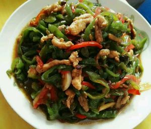 锅内加入油30克(约两汤匙)烧热,下青椒丝炒至断生,然后放入炒好的肉丝;