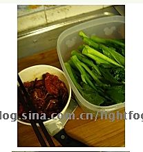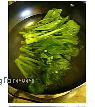 牛肉去血液上粉,芥兰去根,皮,冼净却长条备用。