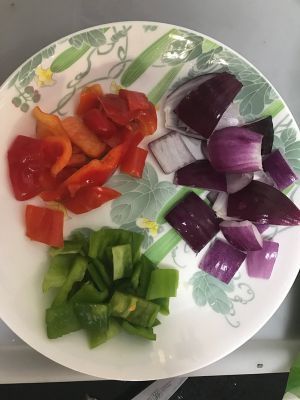 青红椒和洋葱切块备用