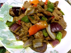 锅里放入少许油,把牛肉放入锅里翻炒几遍。加入洋葱、蚝油、老抽、青椒,再往锅中加入水、勾芡。
