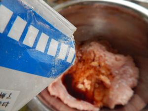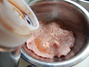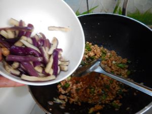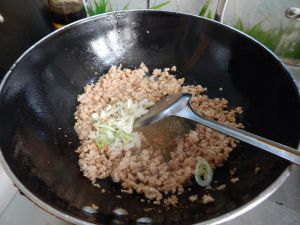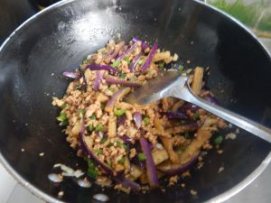 把肉炒散时倒入适量酱油 撒点盐 放一到两瓣八角 翻炒 再倒入之前炒好的茄子。