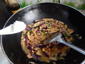加入茄子,放入适量盐(酱本来就有盐味)鸡精,酱油翻炒均匀