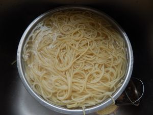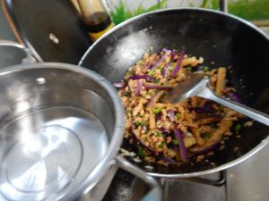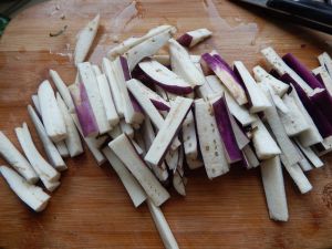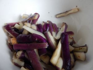 2.炒锅放油至8分热(油要稍微多点),把茄子放下去炸,等茄子软了就捞起沥油待用。