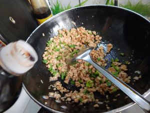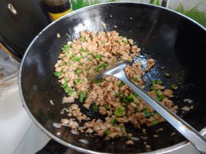 3.炒锅的油倒出,另外放少量油加热,依次下蒜末,萝卜干鱼干,辣椒,炒出味道后把肉末放下去一起炒,这时可以加盐了。