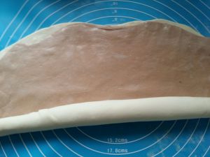 分三分之一面粉出来,加入可可粉揉匀,馒头是否好吃,关键就是揉,直到面团中没有孔为止,把白面和可可粉的面,都赶平,白面在外面可可面在里面卷起来