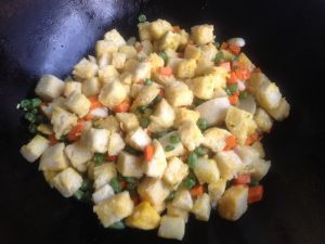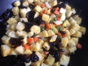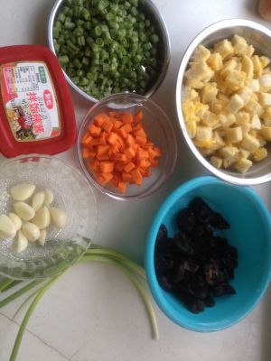 准备好所需材料:馒头切小块,鸡蛋打散浇在馒头里拌匀(这样馒头就吸不了多少油了)、豆角切粒、胡萝卜切粒、木耳泡发洗净,孜然粉忘记拿过来拍了!