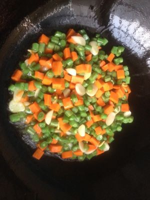 锅里放油加热用蒜瓣炸油后倒入豆角胡萝卜炒至断生!