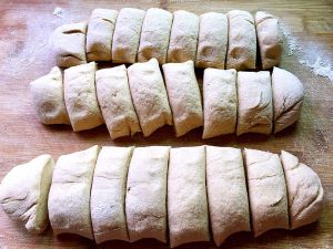 两小时后 取出 在砧板上撒面粉 再揉 揉成长条 大小看情况 我是切了三段