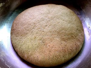 将500G全麦粉放入容器 加入3g酵母粉 我用的是安琪 加温水300ml 揉面团 大约20分钟 盖上盖子 发酵两小时 好啦