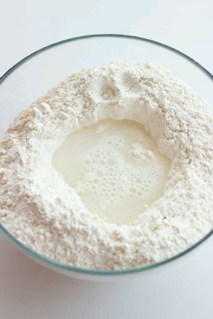 在面粉中间戳一个洞,倒入酵母水。