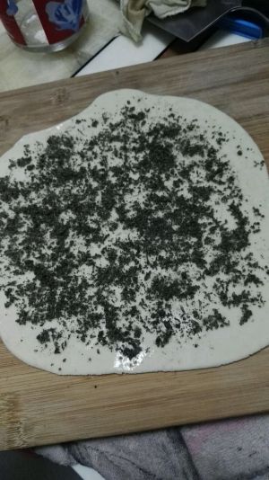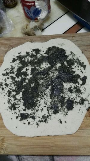 在擀好的面上滴几滴芝麻油,抹开,把黑芝麻黑豆核桃粉均匀地洒在面皮上。