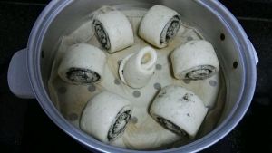 第九步:蒸锅底部刷油,蒸锅温水再次发酵10分钟,大火蒸15分钟,冷却3-5分钟