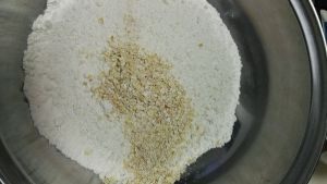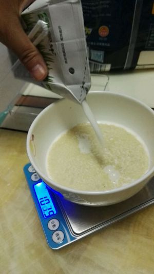 化开的牛奶酵母混合液倒入面粉中,加入燕麦,开始和面。半罐牛奶肯定是不够的,所以在和面的过程中要继续加牛奶,我用了不到一罐牛奶,还剩了些,被我喝掉了
