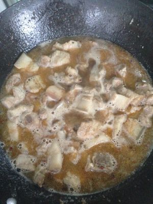 翻炒均匀后大火加入开水,没过排骨就好。中小火盖上盖子。中小火慢慢收汁可以更好的入味。