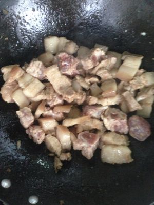 待锅热后倒入五花肉 将肥肉中的脂肪炸出 不然吃起来会觉得肥腻 5min后 倒入排骨一起翻炒 使变色