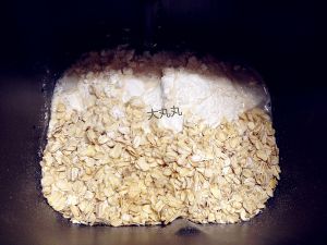 面包机中依次放入砂糖、盐、未放酵母的温水、燕麦和普通面粉、最后放上溶过酵母的温水。