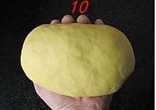 牛奶分次倒入面粉中,成表面光滑的面团后包上保鲜膜,放到温暖的地方静置1-2小时!面团发到两倍大即可