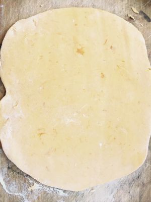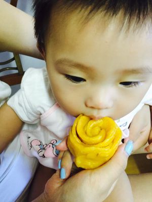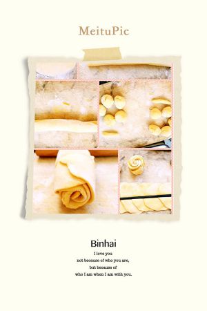 这个做成玫瑰造型。 擀出五块大小切均匀的皮,重叠一起后用筷子按个印记,然后卷起来,用到切俩半。出来俩朵玫瑰花。