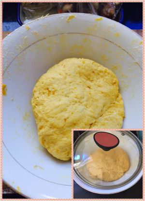 打成南瓜泥后 和着面粉和发酵粉。 揉捏几分钟后盖上盖子涨面。