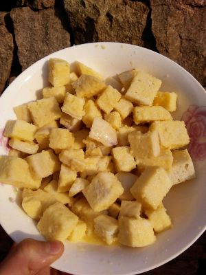 大碗里鸡蛋和红薯淀粉打匀。馒头沾满蛋液入锅煎