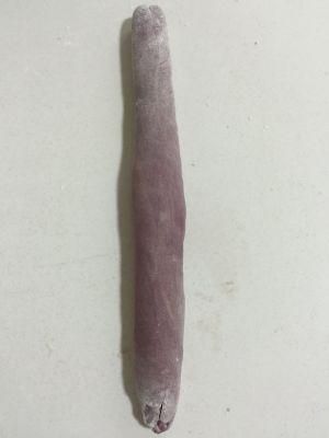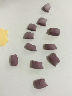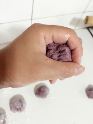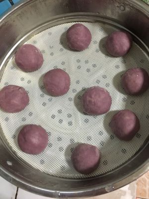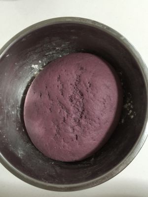 紫薯泥中加入适量面粉,白糖,酵母搅拌均匀!加适量水揉成光滑的面团!发酵至两倍大!