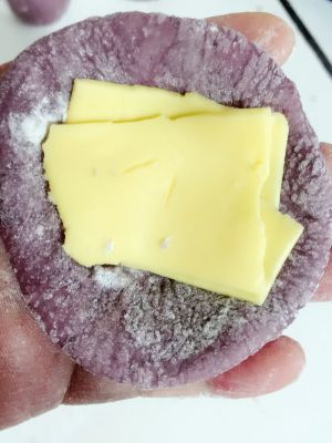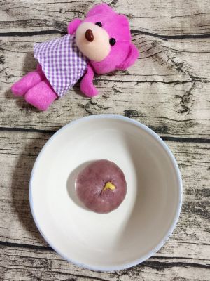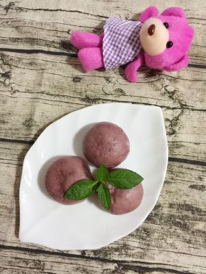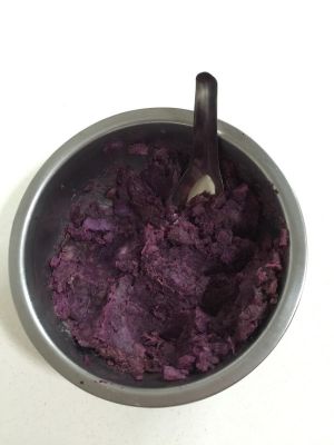 紫薯削皮洗净切成片状!放在蒸锅上蒸熟!蒸熟的紫薯晾凉后用勺子压成泥状!