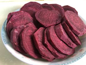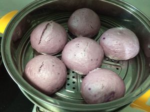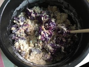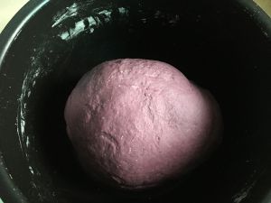 把酵母、紫薯泥、白糖都放入面粉中和面