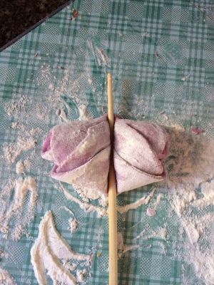 卷起来筷子在中间压好,变成两个玫瑰花馒头
