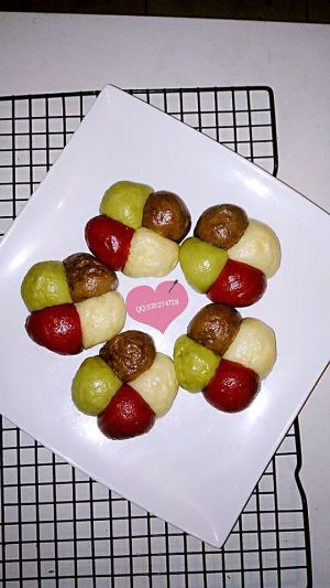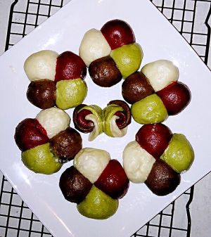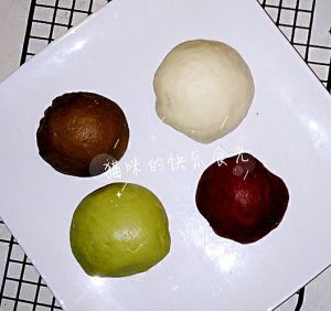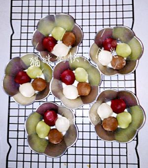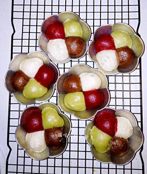每一个颜色的面团放一个入模(模具需要先刷油),全部做完后放在锅里再发酵15分钟。开火蒸,大火烧开后转小火蒸15分钟关火,焖5分钟后再揭开盖子。