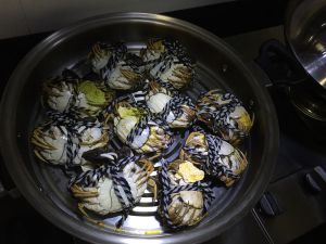 在大闸蟹肚上还放几片姜片,然后翻过来蒸,这样子蟹黄才不会浪费,蒸十五分钟左右即可~