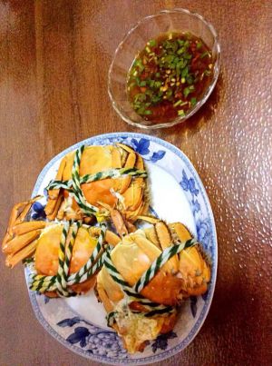 将蒸好的蟹取出,解去绳子装盘,吃时蘸料汁即可。