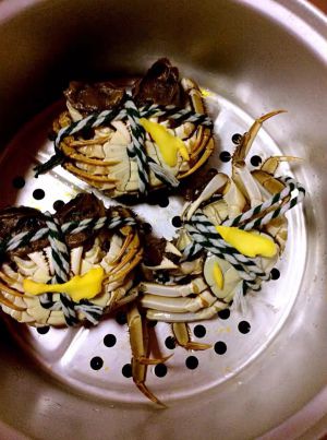 将大闸蟹用牙刷刷洗干净,捆绑大闸蟹的绳子可以不用解开。蒸锅中放入水烧开后,将大闸蟹肚子朝上放入蒸锅中,盖上锅盖用大火蒸。一般四两的大闸蟹蒸15分钟即可,蒸的时候喜欢切姜片放在上面去腥避寒;