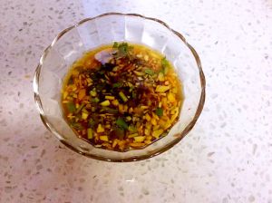 老姜洗净去皮切碎,小葱洗净切碎;将生抽、香醋、葱姜末放入碗中,混合均匀蘸料备用。