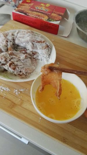 腌制好鸡肉后,准备一份蛋液,一份干淀粉,一份面包糠。