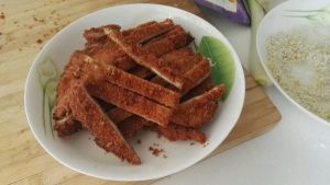 大约炸至一分多钟基本就好了,切成长条,美味炸鸡排就做好了