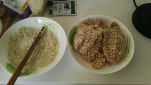 将蘸好蛋液的鸡肉,放到面包糠上裹匀待炸
