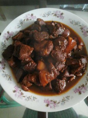 中间过一个小时将切块的胡萝卜放到过肉上面,盖上锅继续炖,记得中间再尝尝锅,放适量盐,最后10分钟可以大火收汁,上色。就可以出锅了。