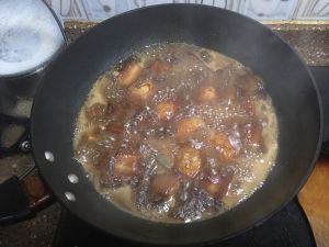 等冰糖全部融化后,放入控干水的五花肉翻炒出糖色。