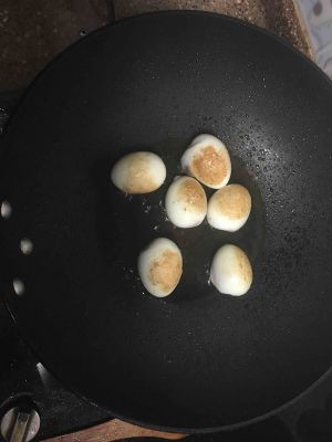 用锅中煸出的油将煮熟的鸡蛋煎至金黄,捞出备用!