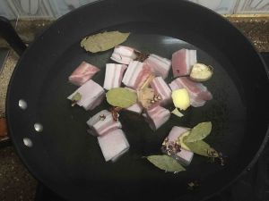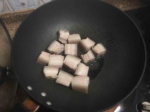 肉块捞出后滤干,将炒锅烧热,将肉块放入锅中煸油!