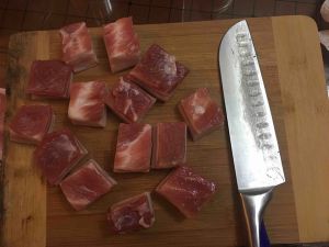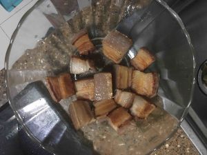 另烧锅热水,将肉块放入热水中,水中点入几滴食醋,可分解油脂!